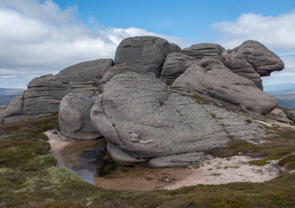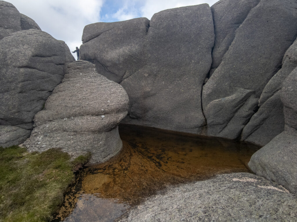 The next day we explored some of the large rocky outcrops on the north-east side of Ben Avon before descending to the rarely visited Lochan na Gabhar. We’d though to camp here next, but with unsuitable conditions continued west eventually finding a good spot amongst the glacial lumps below Sron na h-lolaire just before sunset.