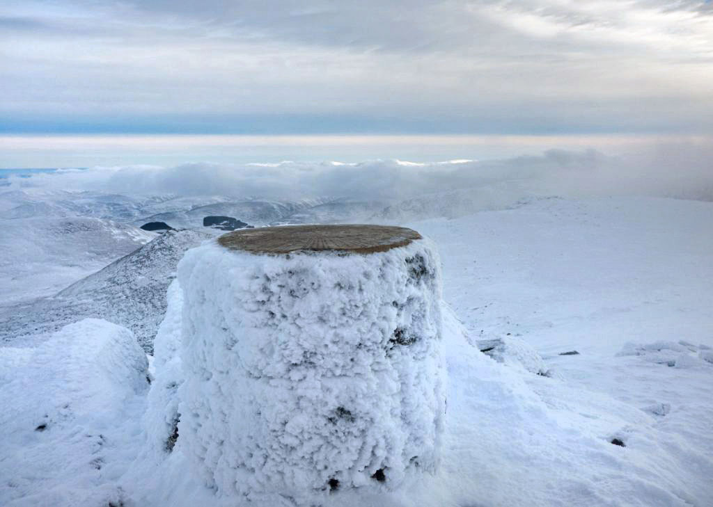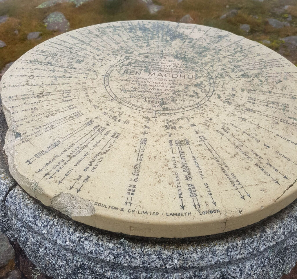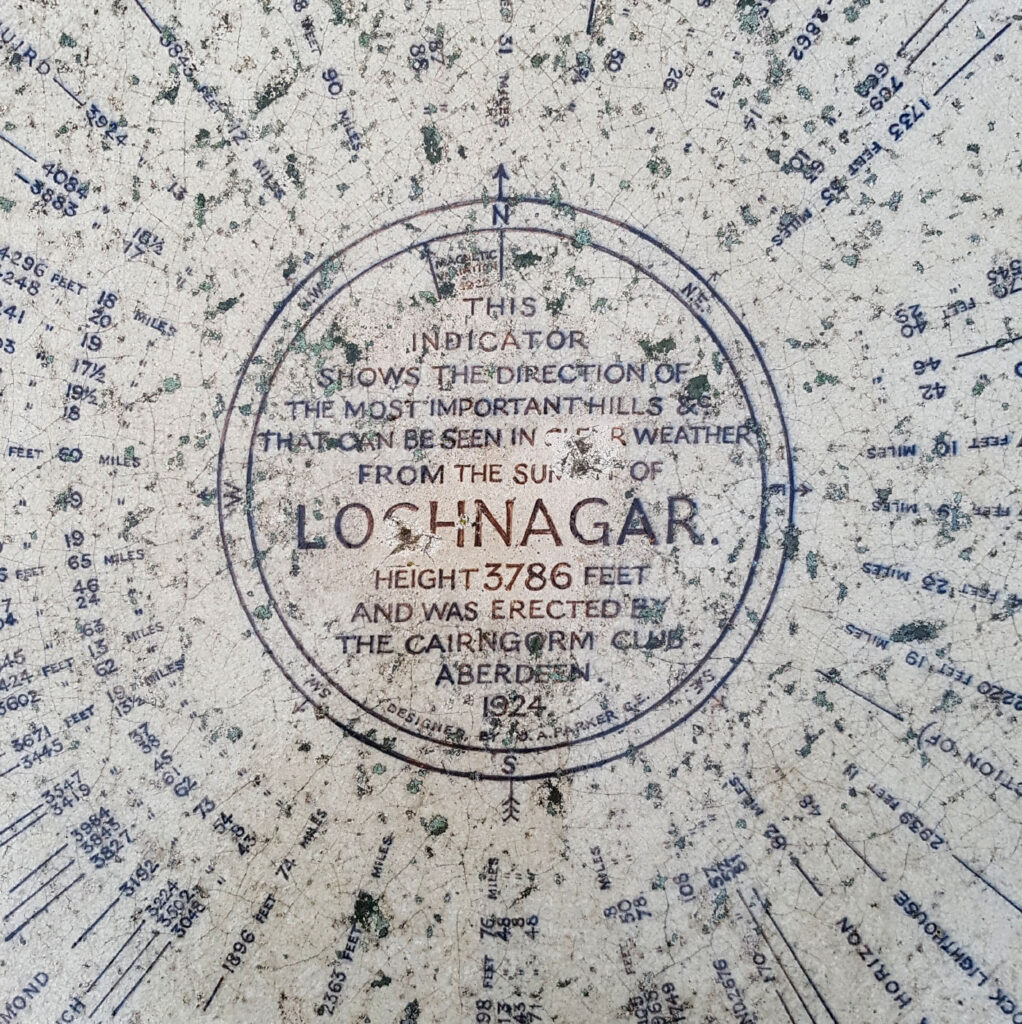 The Club erected summit indicators (a disk with lines and distances to nearby mountains), on Lochnagar in 1924 and Ben Macdui in 1925, and also previously had one on Blue Hill near Aberdeen (now subsequently replaced). We aim to replace the Ben Macdui and Lochnagar indicators in 2026 – the original ceramics are now weathering badly, but have done extremely well for 100 years of exposure to the extreme conditions that can be found at the highest points in The Cairngorms.